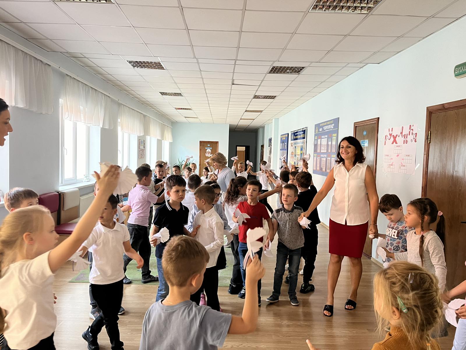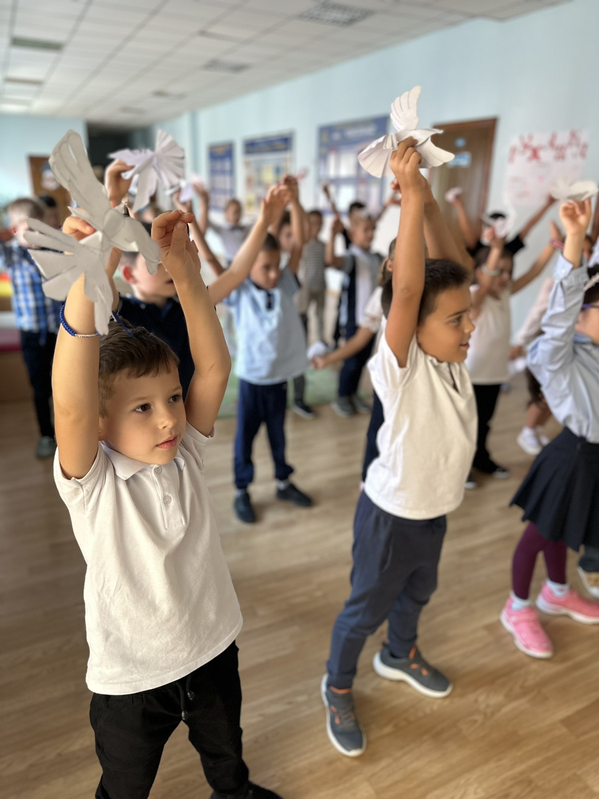 В ліцеї "Євроленд" відбувся яскравий флешмоб за участю наших маленьких першачків та учнів 2-х класів. Діти з натхненням виготовили паперових голубів — символів миру, які власноруч прикрасили кольоровими візерунками та добрими побажаннями для всієї країни.