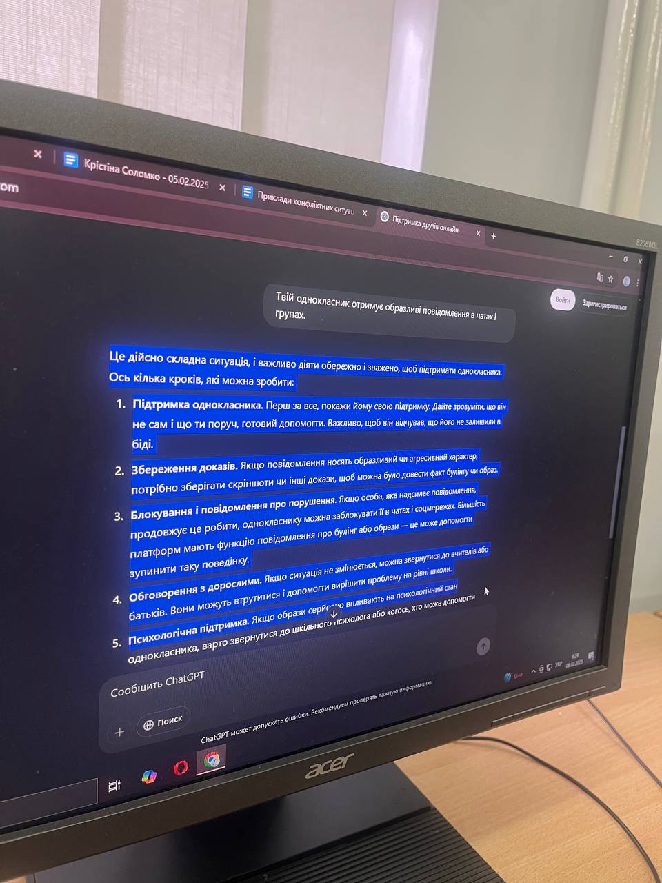 Окрім теоретичної частини, учні також мали змогу дослідити можливості штучного інтелекту у вирішенні конфліктних ситуацій. Це допомогло їм краще зрозуміти, як сучасні технології можуть сприяти безпеці в цифровому середовищі.