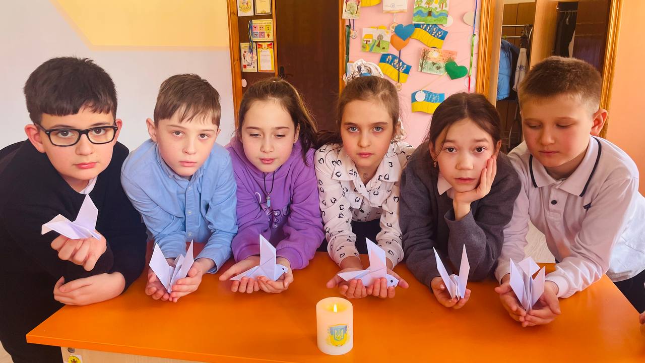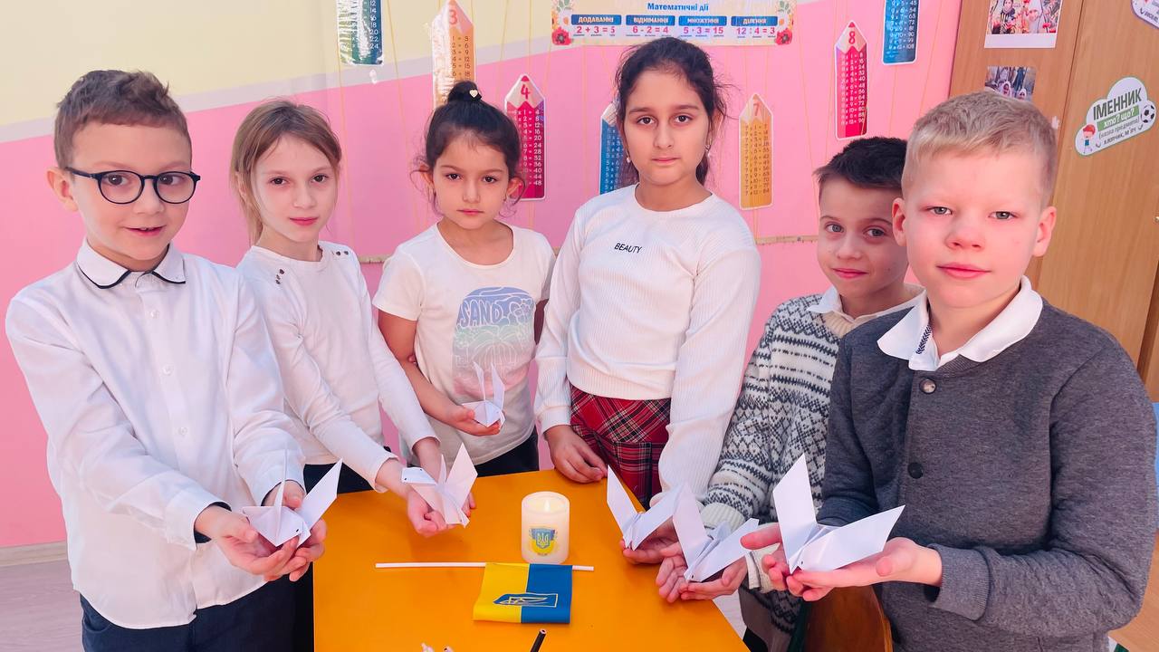 За допомогою техніки оригамі школярі склали білих паперових птахів – символів чистоти, миру та душ Героїв, які відлетіли у небеса. Кожен паперовий голуб став своєрідною даниною шани тим, хто віддав своє життя заради нашого майбутнього.
