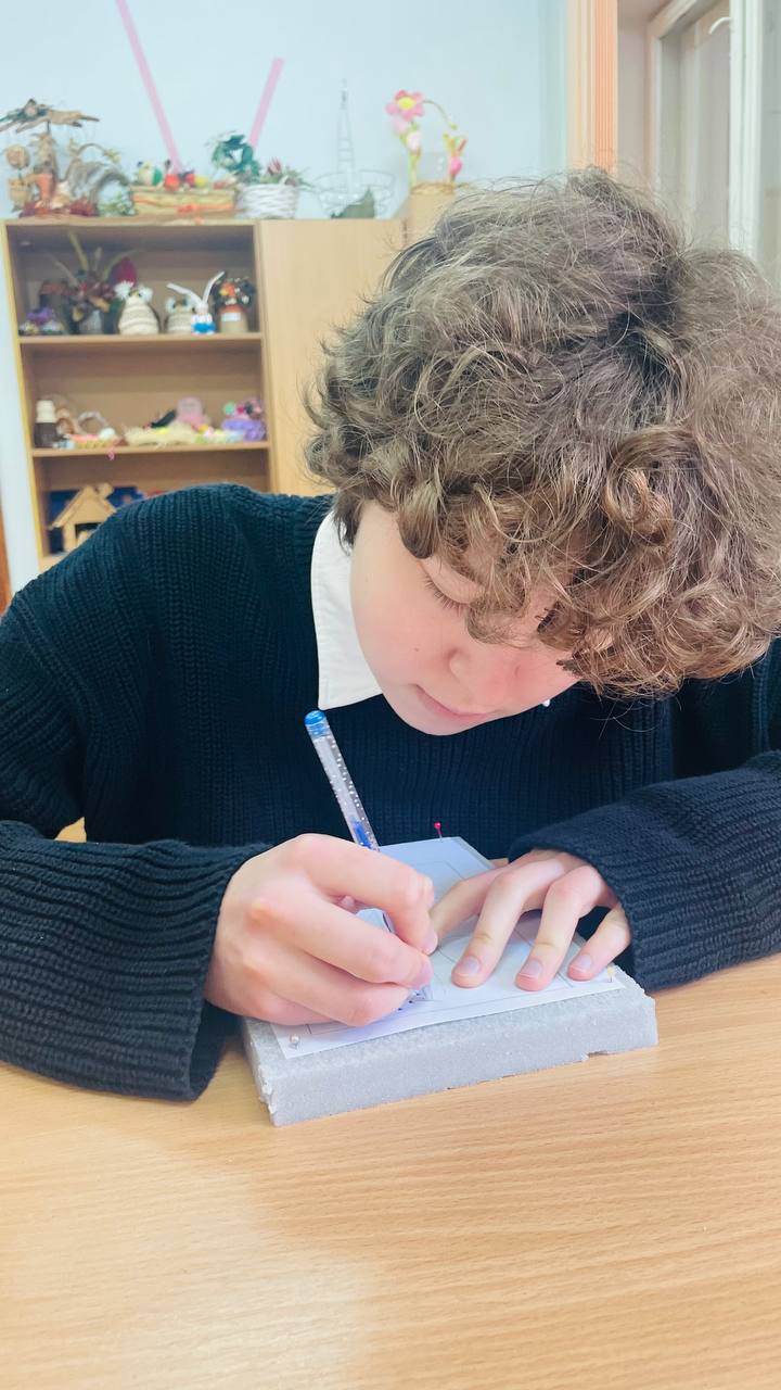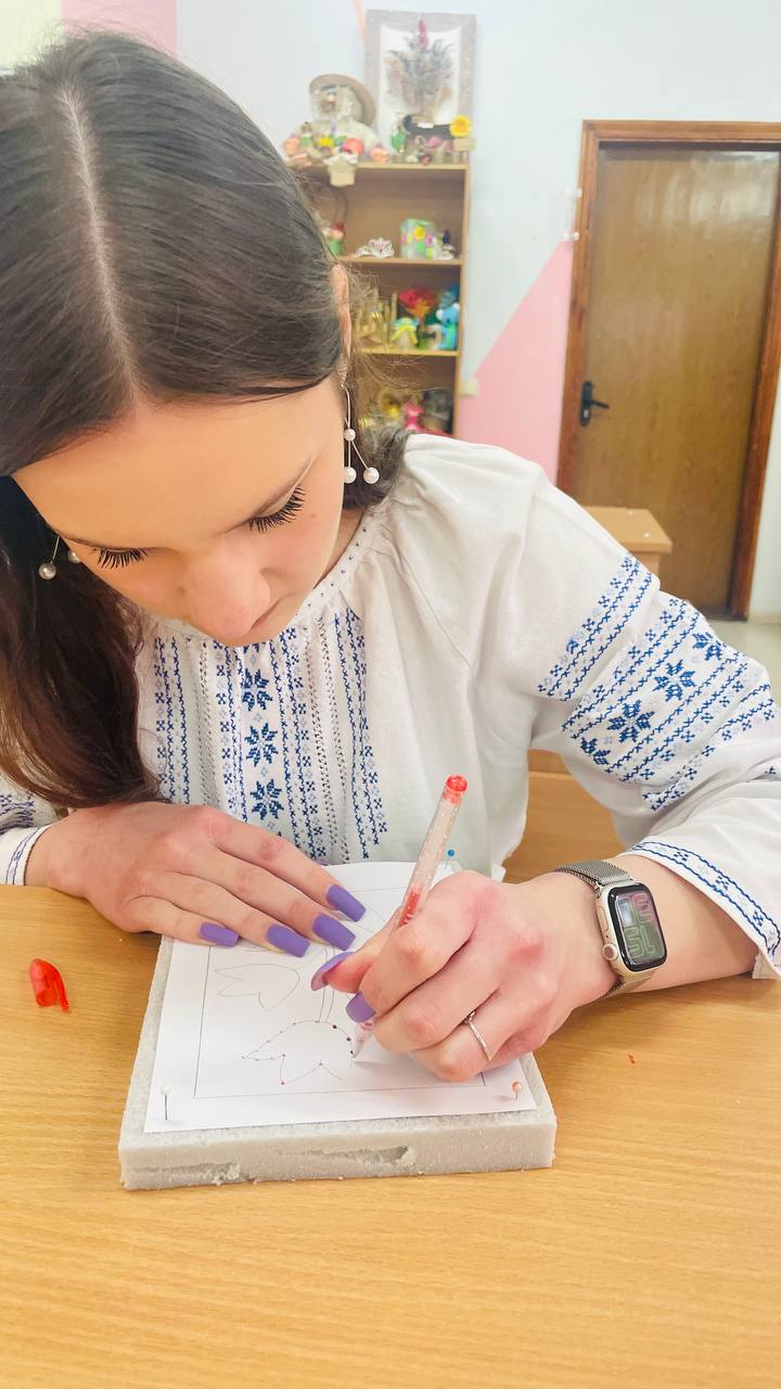 На першому занятті учениці зробили важливий крок — перенесли ескізи майбутніх композицій на пінопластову або іншу щільну основу. Також вчилися добирати кольори, текстури, поєднувати елементи так, щоб створити цілісну композицію. Це підготовчий, але дуже відповідальний етап, що задає тон усій подальшій роботі.