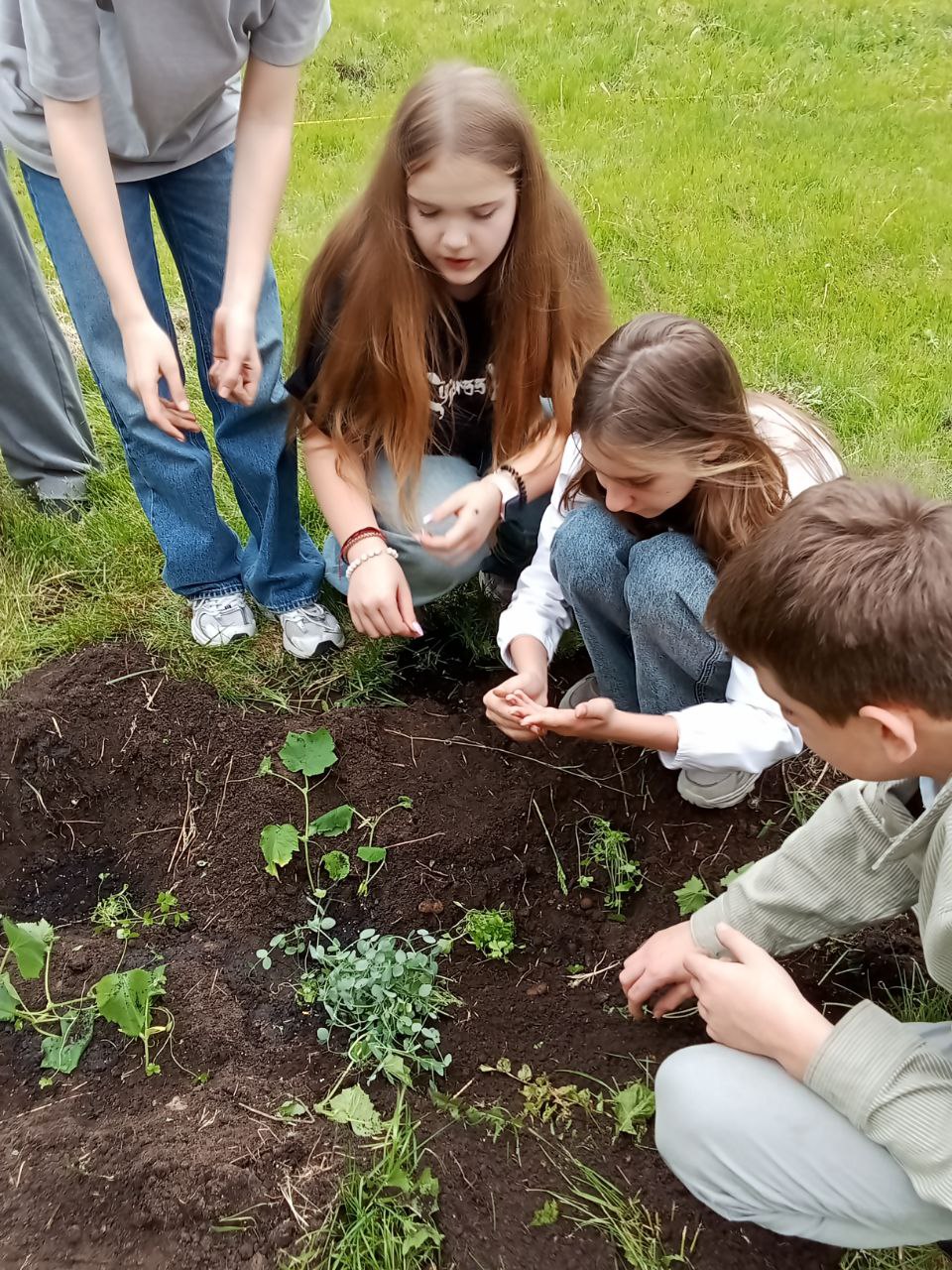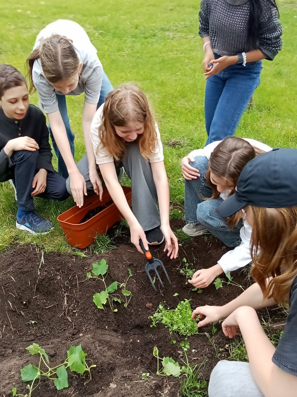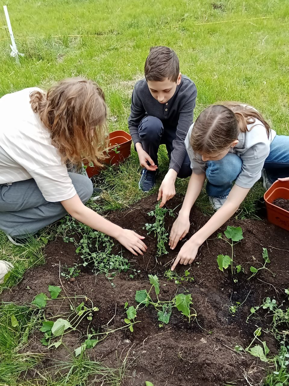 З березня школярі дбайливо вирощували з насіння розсаду огірків, петрушки, гороху та помідорів. Тепер, коли рослини вже мають 5–7 справжніх листочків, їх було висаджено у відкритий ґрунт.