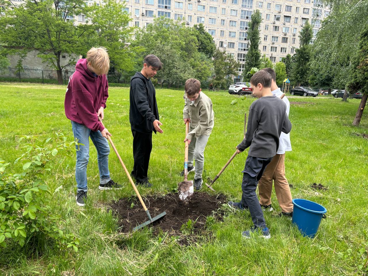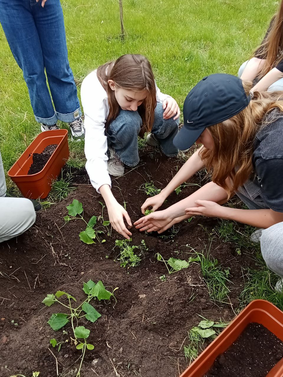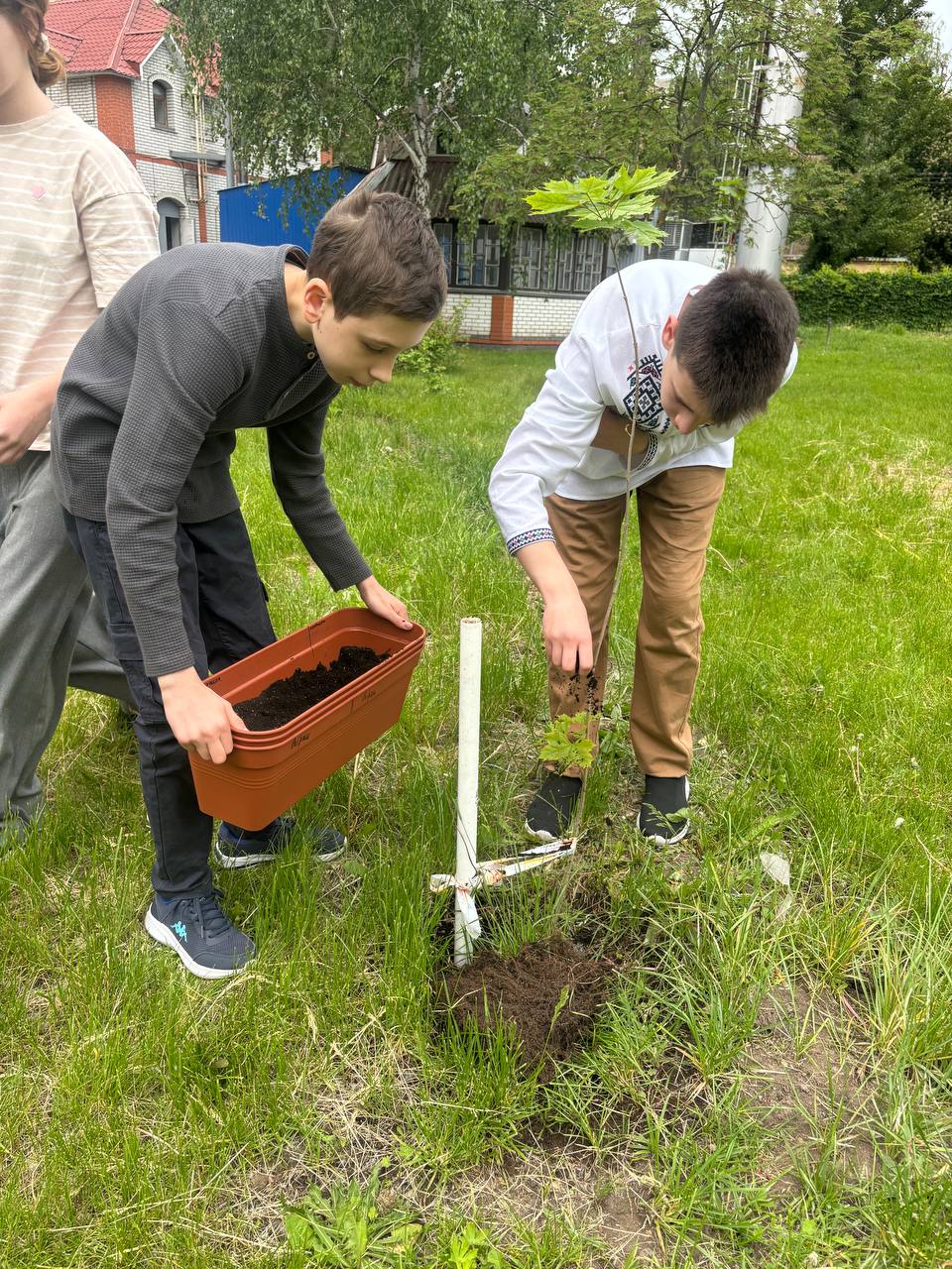 З березня школярі дбайливо вирощували з насіння розсаду огірків, петрушки, гороху та помідорів. Тепер, коли рослини вже мають 5–7 справжніх листочків, їх було висаджено у відкритий ґрунт.