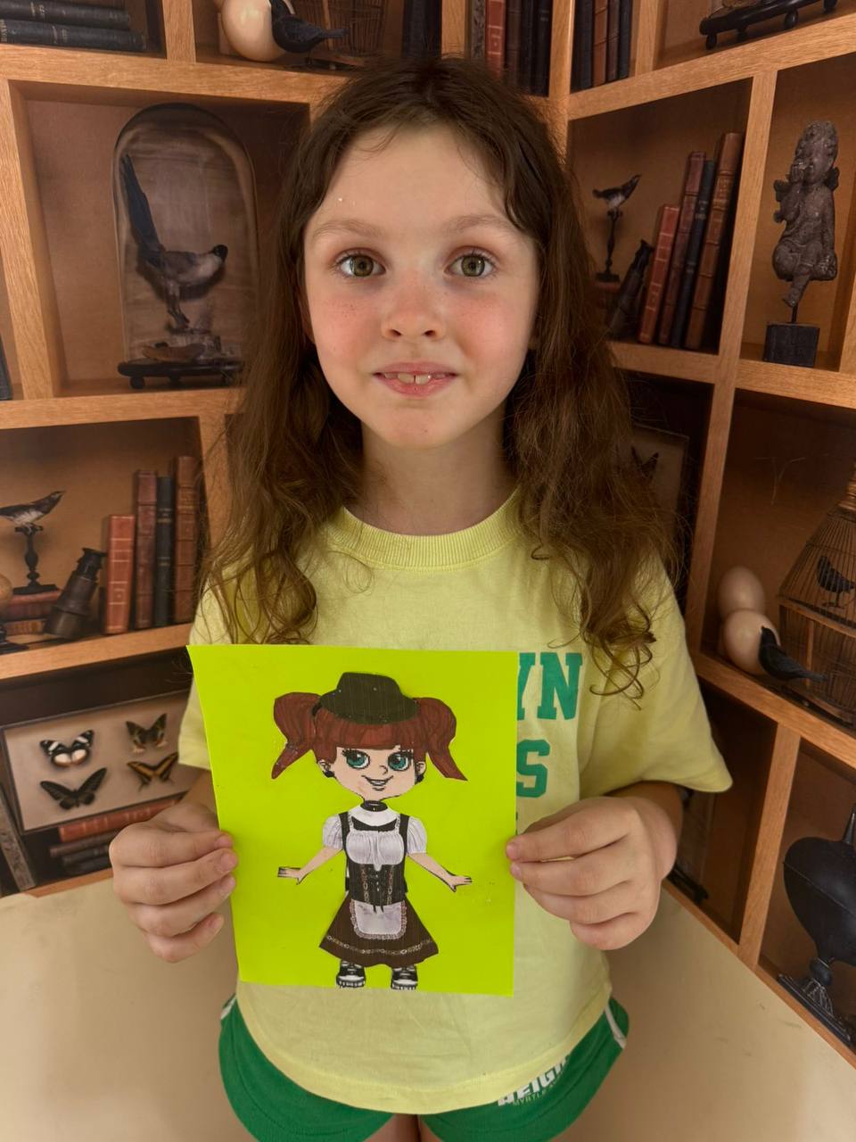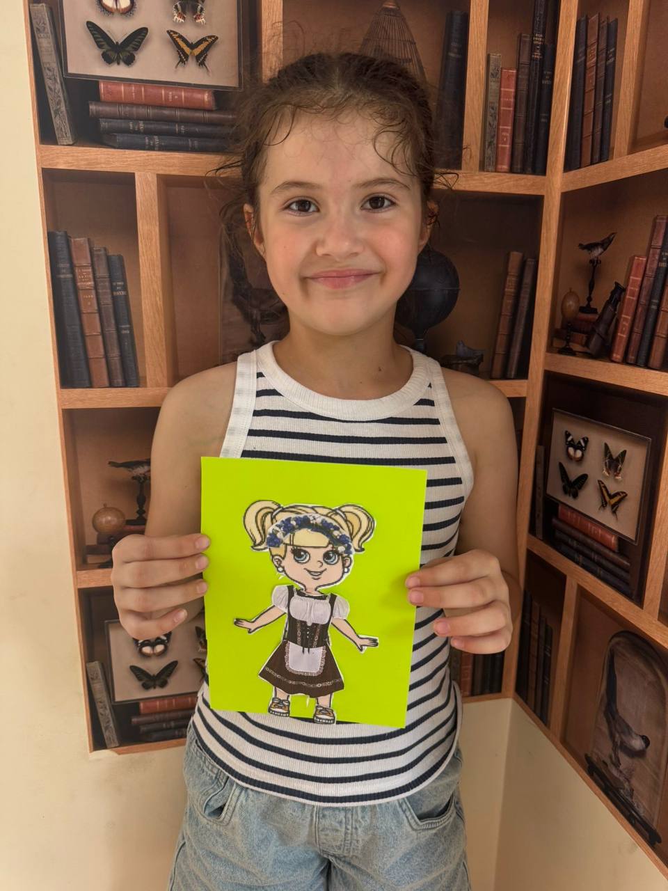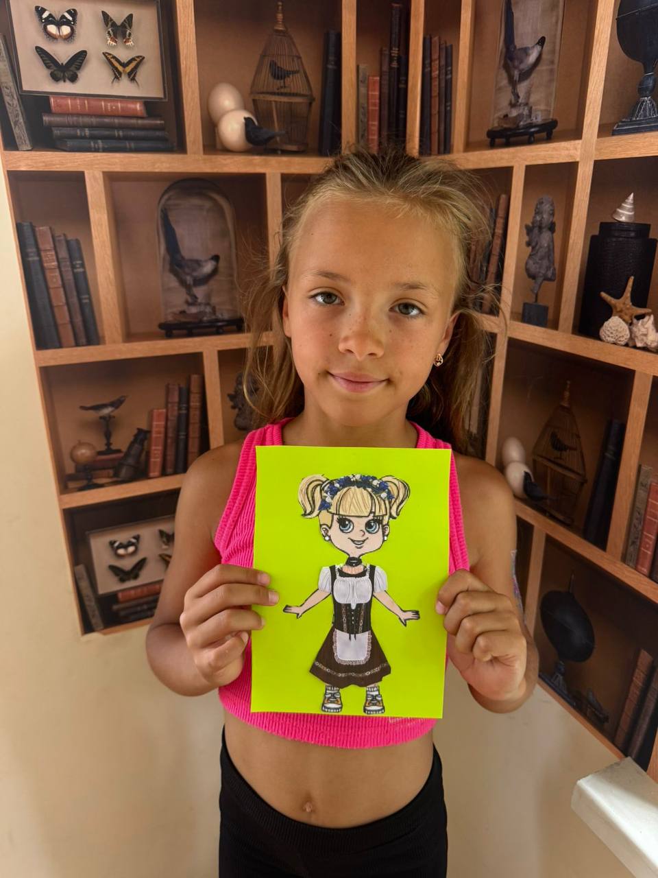 Ми вивчали традиційний німецький одяг — дірндлі й льодерхозени — і перетворились на справжніх дизайнерів, створюючи стильні костюми для паперових ляльок. Кожен образ — унікальний, яскравий, з любов’ю до деталей.
