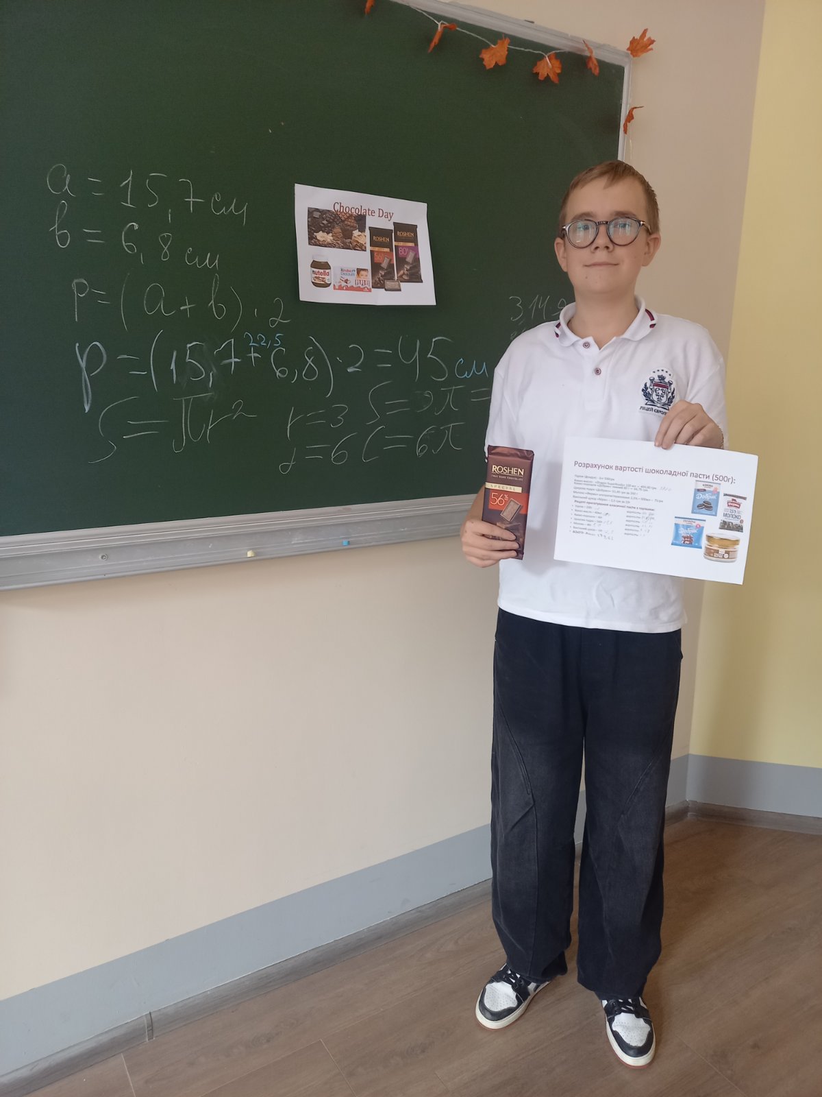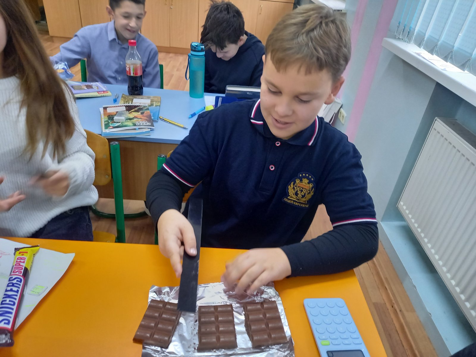 На уроці математики: повторили поняття частини цілого та ділення, розбиваючи плитку шоколаду на частини; повторили формули площ трикутників, ромбів, кругів, об’єму прямокутного паралелепіпеда та кулі. А також спробували провести розрахунки вартості продуктів, які можна використати для приготування класичного чорного шоколаду в домашніх умовах, гарячого шоколаду та шоколадної маси. Розв'язували задачі про нескінчену шоколадку, порахували перегодки (шоколадні плитки) з платформи Matifik, вирішували практичні задачі на вагу з шоколадом, на відсотки.