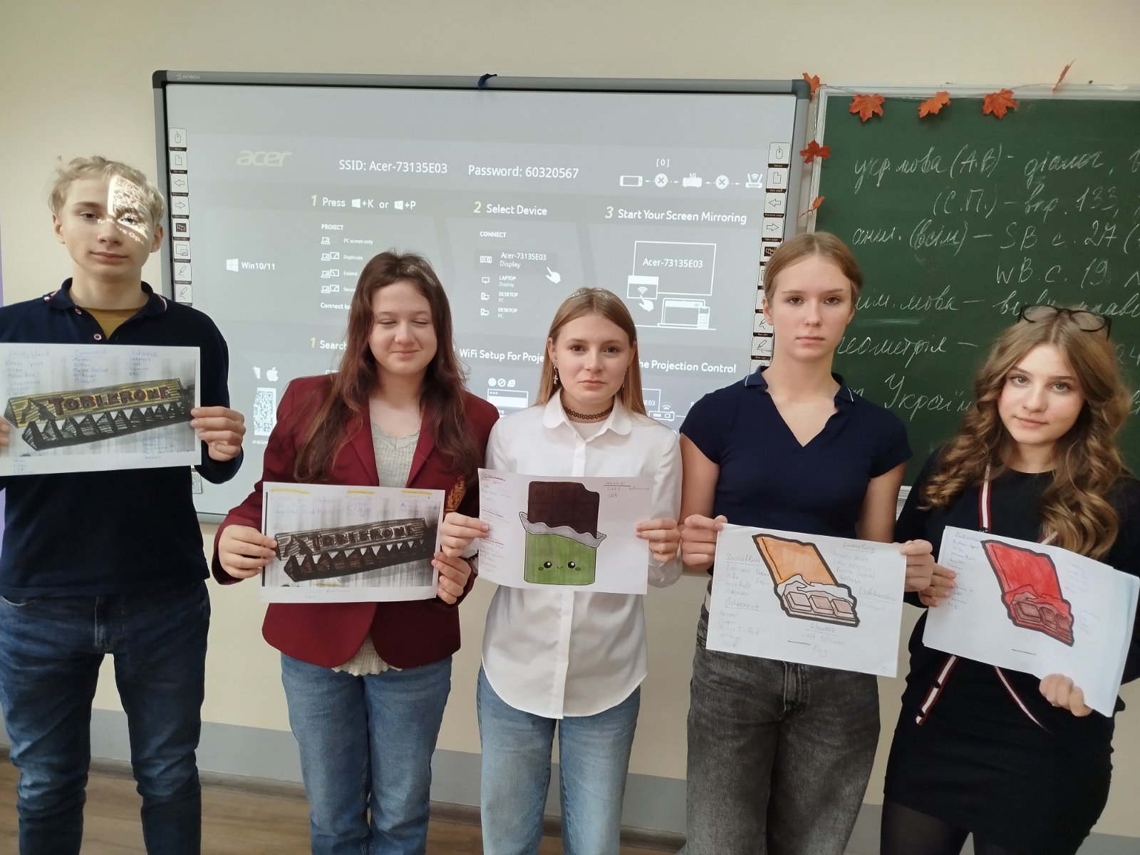 На уроках української мови: учні продемонстрували «Рецепт щасливого учня», присмачений шоколадними ласощами, також діти створили цукерку з мінітвором «Даруйте всім шоколад-світ стане щасливішим!» з використанням фразеологізмів. Створювали рекламні оголошення за допомогою різних видів речень та простих і складених підметів про відомі шоколадні марки, а допомагав їм у цьому Віллі Вонка.