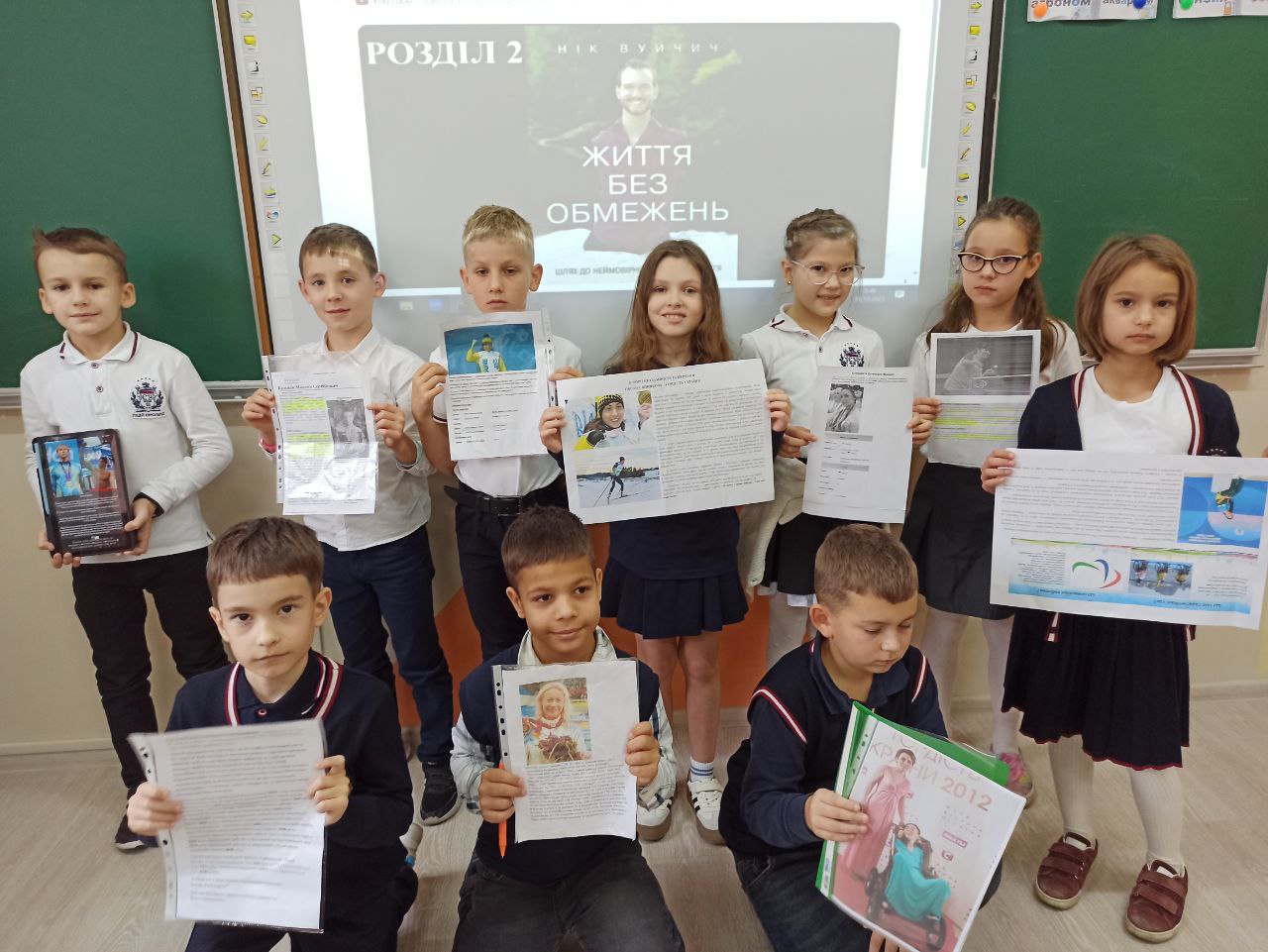 А учні 3-А класу підготували проект «Життя без обмежень», у якому обговорювали силу людського духу й віру в себе. Під час уроку діти знайомилися з історією Ніка Вуйчича — людини, яка народилася без рук і ніг, але стала всесвітньо відомим мотиватором, письменником і прикладом незламності.