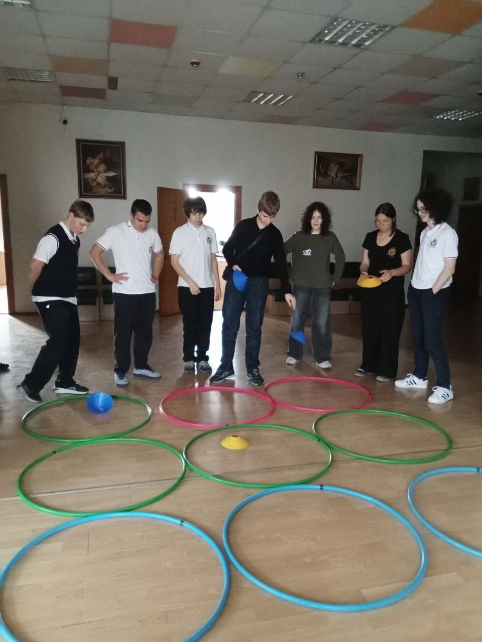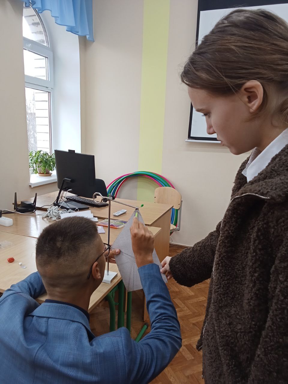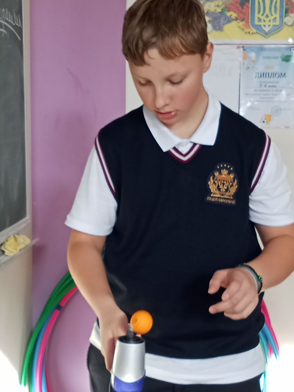 • "Принцип Бернуллі з феном та кулькою": За допомогою фена та легкої кульки (для пінг-понгу) показали, як кулька "висить" у струмені повітря. Принцип: Принцип Бернуллі (чим швидший потік рідини/газу, тим нижчий тиск).