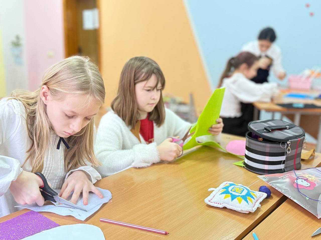Творчість у дії: дівчатка шиють фетрові сумочки