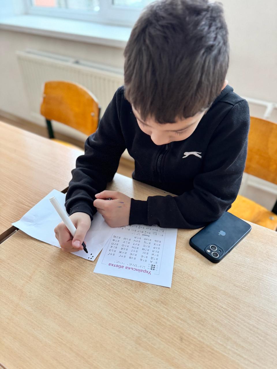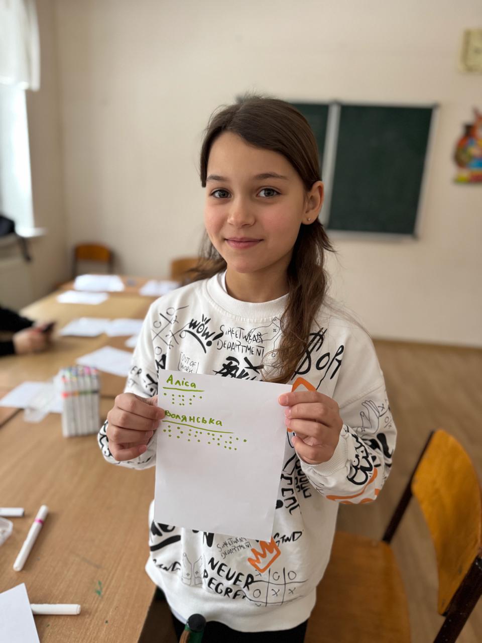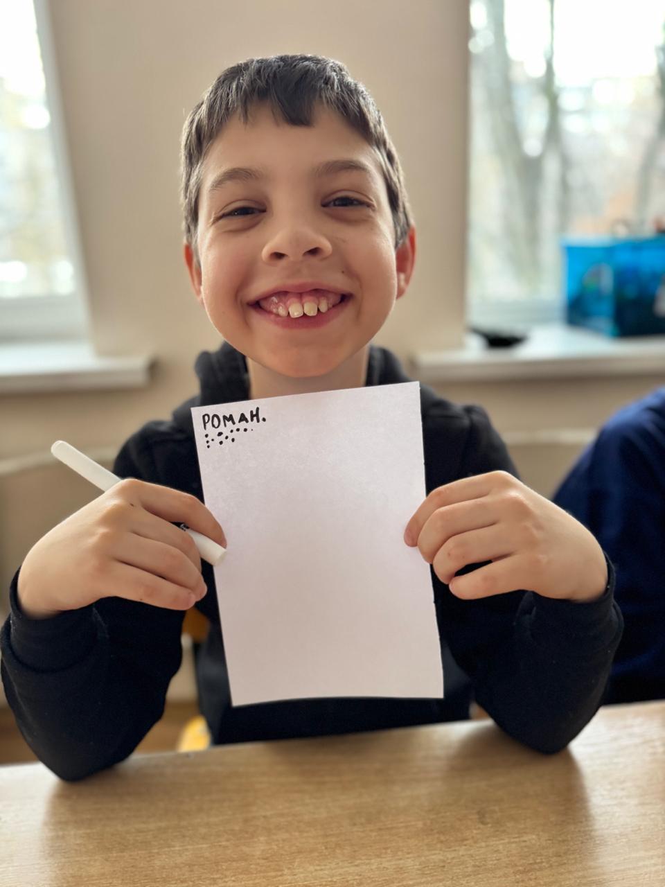 Діти дізналися, як люди з порушенням зору читають і пишуть на дотик, спробували «прочитати» слова пальчиками та кожен написав своє ім’я, використовуючи рельєфні символи.