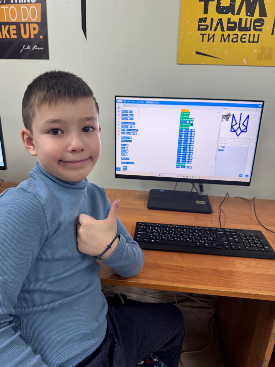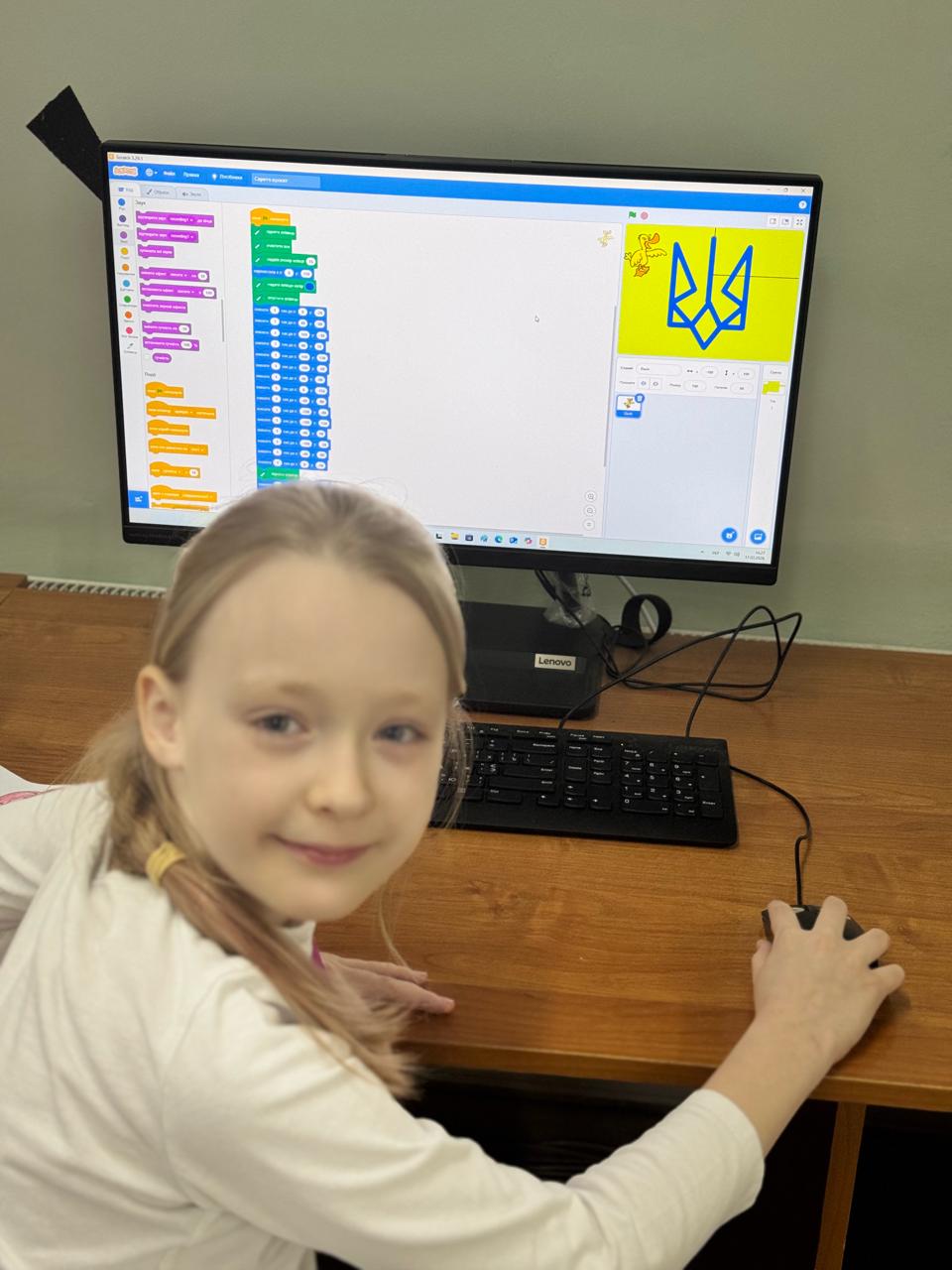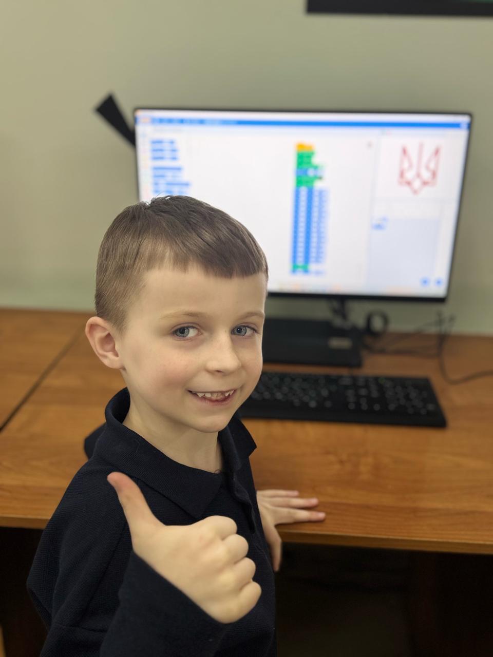 На уроках інформатики учні других класів поєднали вивчення державної символіки із сучасними технологіями. Працюючи в програмі Scratch, діти створювали власні творчі проєкти, малювали Тризуб, добирали кольори та вдосконалювали навички програмування й роботи з графічними інструментами.