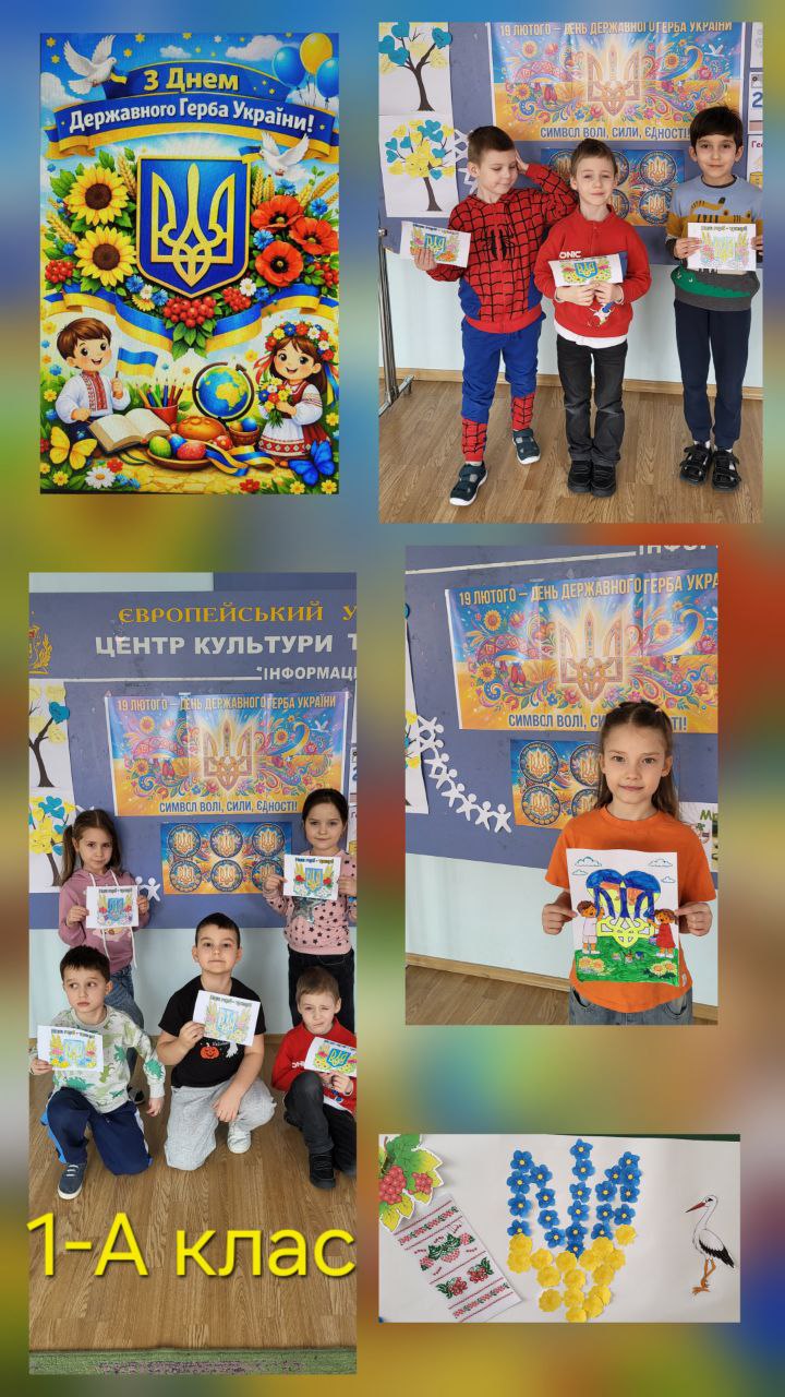 Учні 1-А класу взяли участь у пізнавально-виховному занятті, під час якого дізналися цікаві факти про історію українського герба, значення тризуба та його шлях крізь віки — від княжих часів до сучасності. Особливою частиною стала творча робота: діти створювали групову аплікацію та малюнки із зображенням тризуба, прикрашаючи їх у національних синьо-жовтих кольорах.