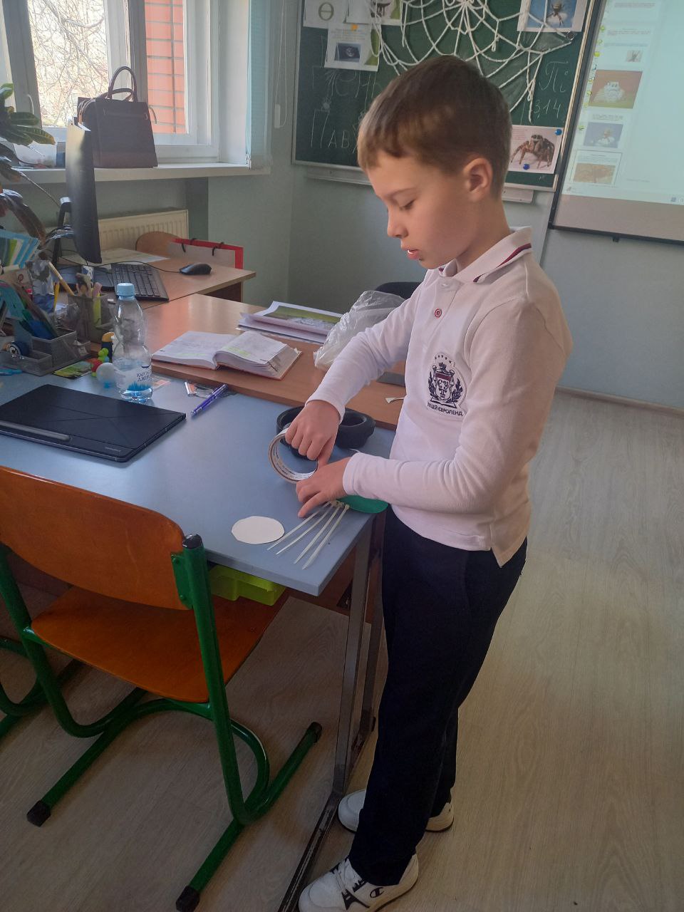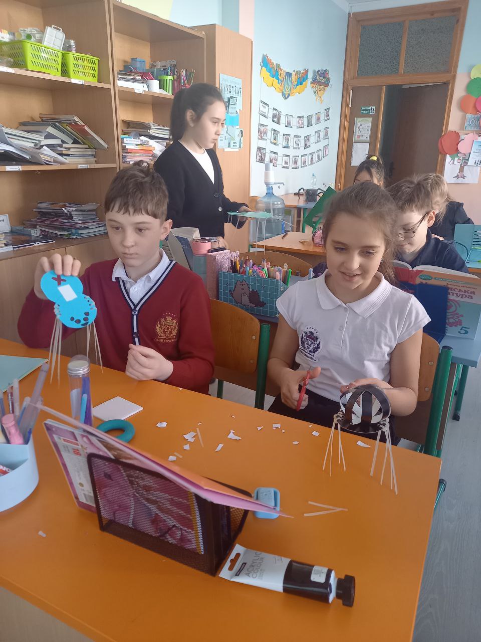 Кульмінацією уроку стала інженерна діяльність. Учні власноруч створювали моделей павуків, використовуючи доступні матеріали: картон, будівельні стяжки та інші підручні засоби. Тут проявилися навички конструювання, просторового мислення та креативності. Важливо, що кожен виріб був не лише естетичним, а й продуманим з точки зору форми та пропорцій.