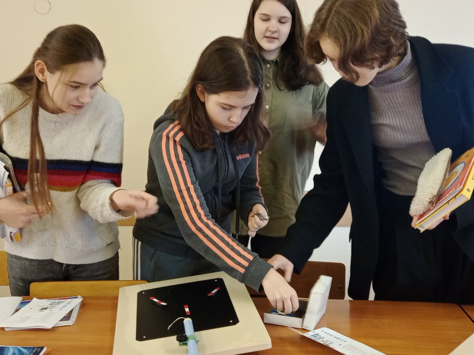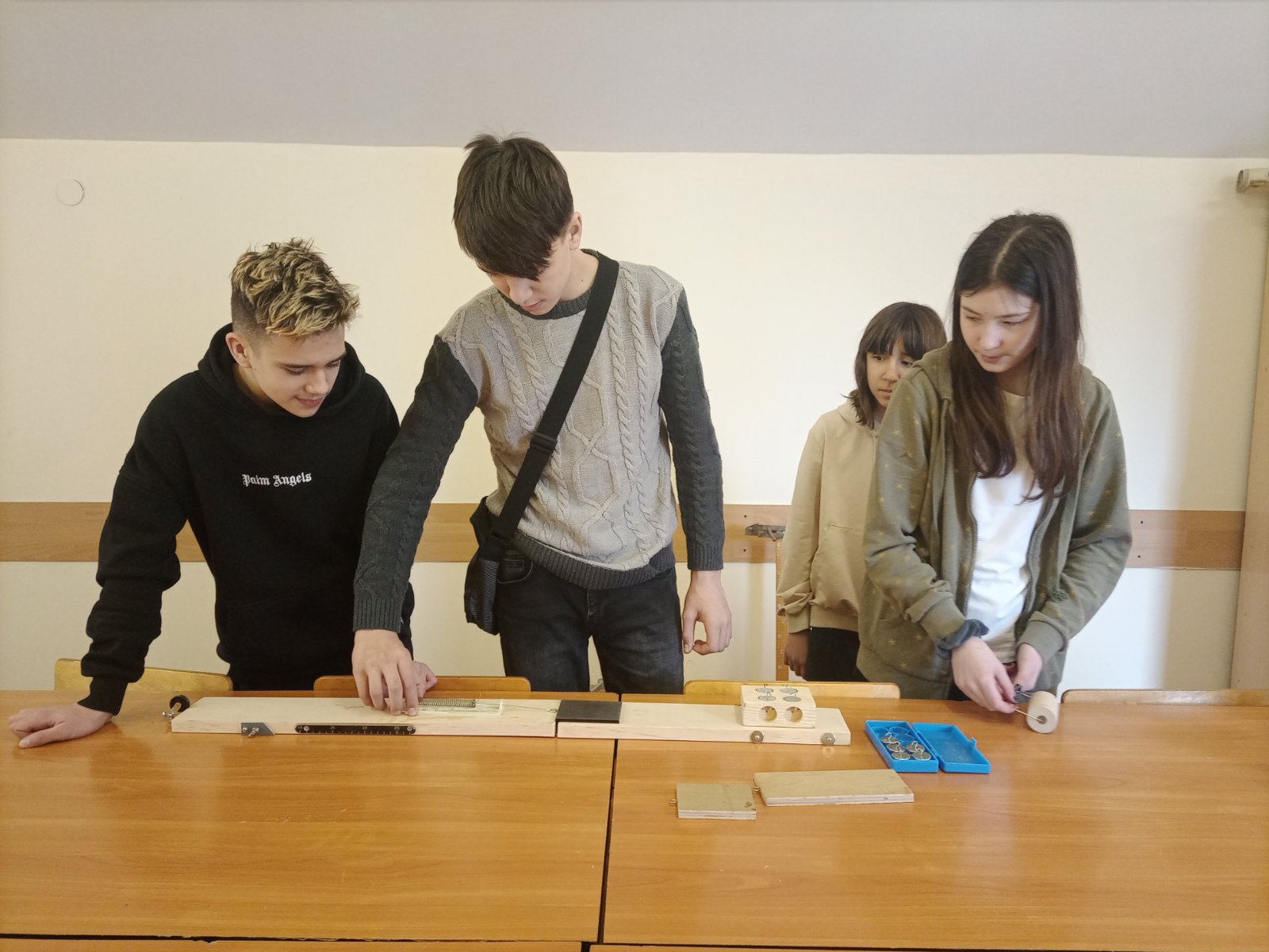 Учні 7А класу ліцею « Євроленд» визначають коефіцієнт тертя ковзання, вимірюють атмосферний тиск за допомогою барометра-анероїда, учні 8А класу досліджують електричне коло з послідовним з’єднанням провідників, учні 9А класу вивчають тему «Рух і взаємодія. Закони збереження».