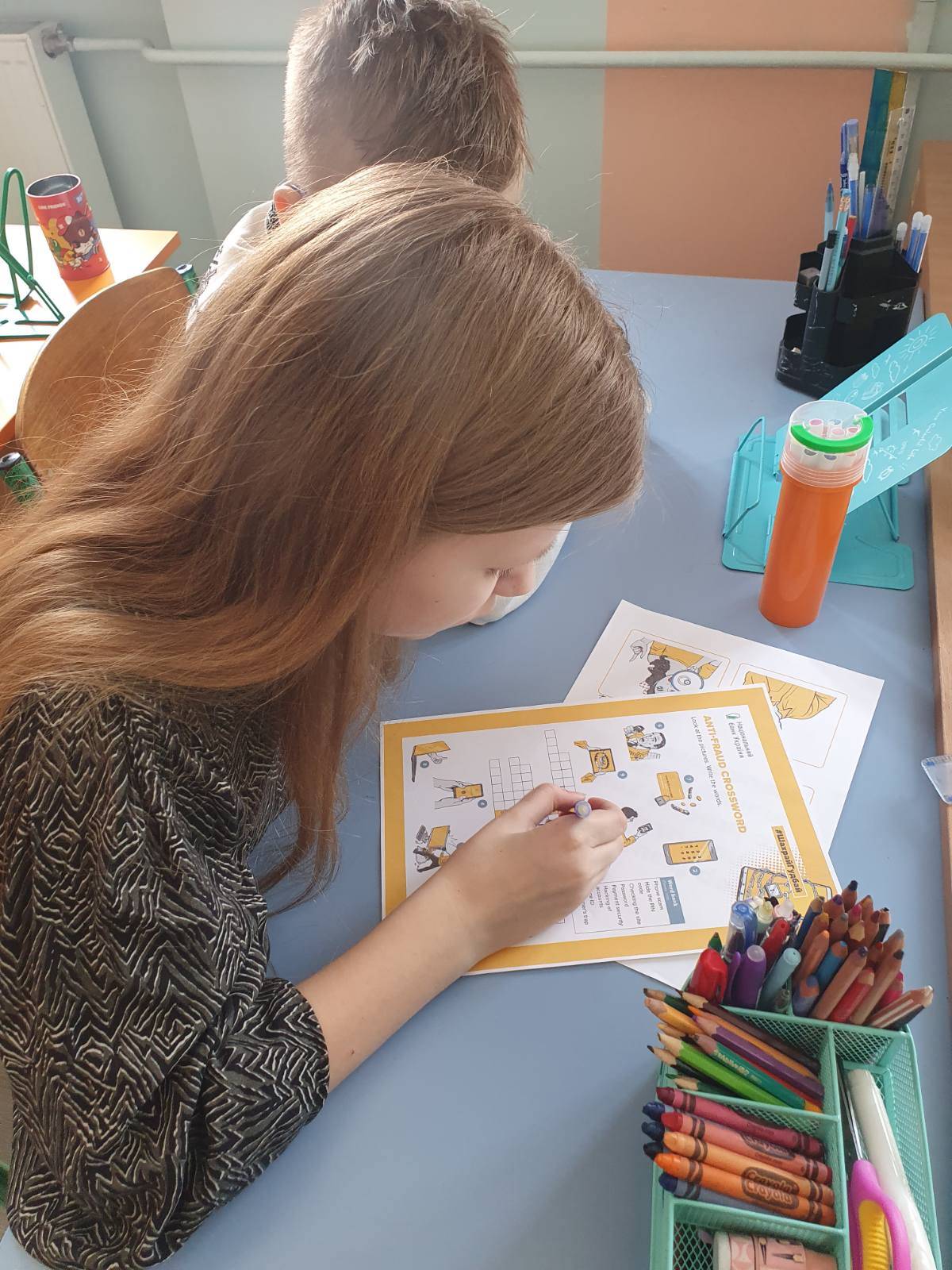 Під час уроку учні знайомились з базовим комплексом порад щодо безпечних онлайн транзакцій "ШахрайГудбай"; вирішували головоломку-доміно "Платіжна безпека"; розгадували кросворди "антишахрай", а завершили заняття створенням плакату з попередньо вирізаних картинок із зображеннями шахраїв та їхніх жертв.