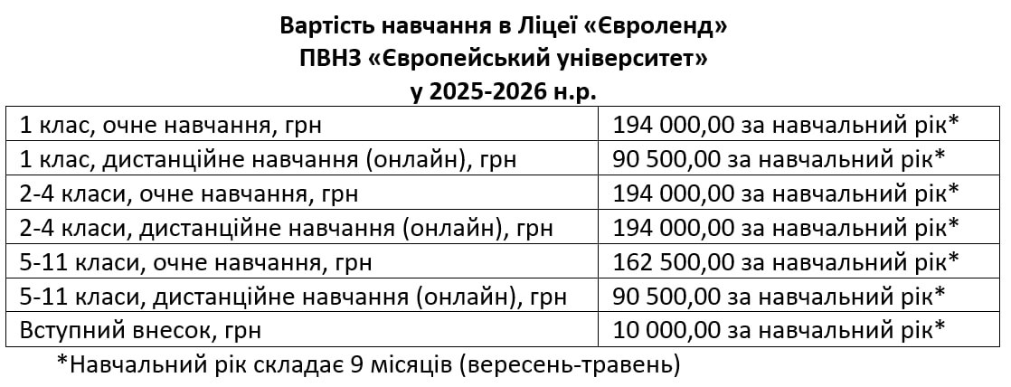 Вартість навчання у Ліцеї «Євроленд» Європейського університету у 2025-2026 н.р.